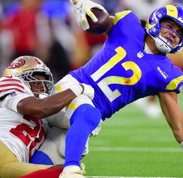 San Francisco played without quarterback Brock Purdy, receivers Jauan Jennings and Ricky Pearsall, and tight end George Kittle, yet still built a 17-7 halftime lead over the Rams.